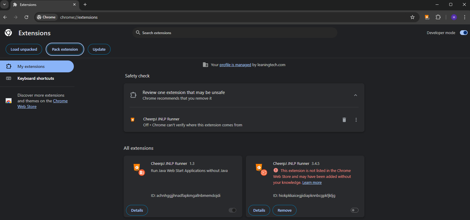 This tutorial will walk you through the steps to pack the CheerpJ JNLP Runner extension in Chrome, making it ready for distribution and deployment, particularly useful in enterprise environments like deploying through Group Policy Objects (GPOs).